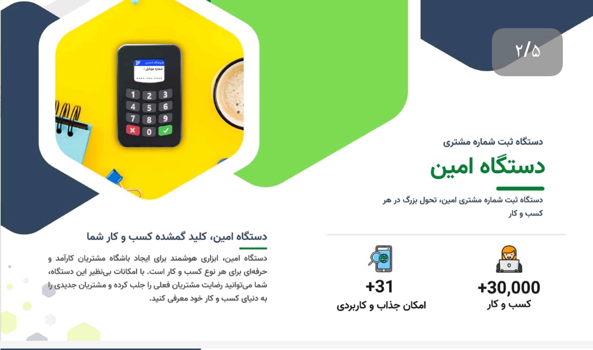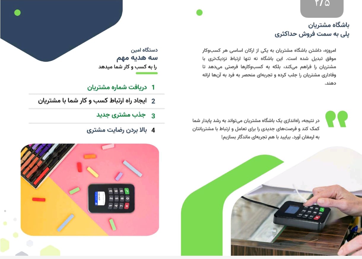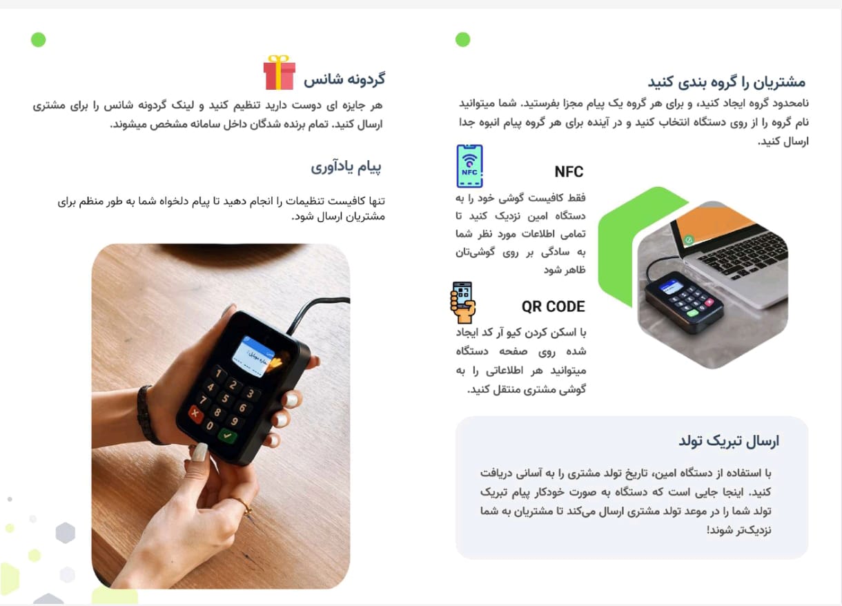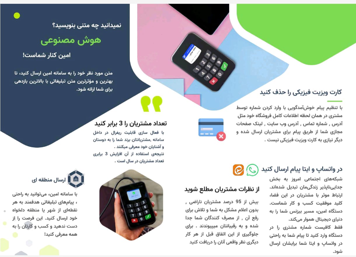 دستگاه ذخیره شماره مشتری امین یک راه ساده برای ثبت شماره موبایل مشتری است . عملکرد دستگاه ذخیره شماره امین با استفاده از وایفای بوده و نیاز به هیچ گونه وسیلهی جانبی ندارد . تمامی شماره های وارد شدهی مشتریان , داخل پنل دستگاه , ذخیره شده و میتوان از طریق آن پیامک ارسال نمود . با وارد کردن شماره داخل دستگاه ثبت شماره موبایل , پیامک خوش آمدگویی برای مشتری ارسال شده که میتواند اطلاعات فروشگاه و همچنین لینک صفحات مجازی فروشنده باشد . همچنین امکان ارسال نظرسنجی , دریافت تاریخ تولد مشتری و ارسال پیامک اطلاع رسانی به مشتریان داخل این دستگاه ذخیره شماره موبایل وجود دارد . امکان ویرایش و افزودن شماره مانند یک دفترچه تلفن برای شماره های ذخیره شده نیز فراهم میباشد .